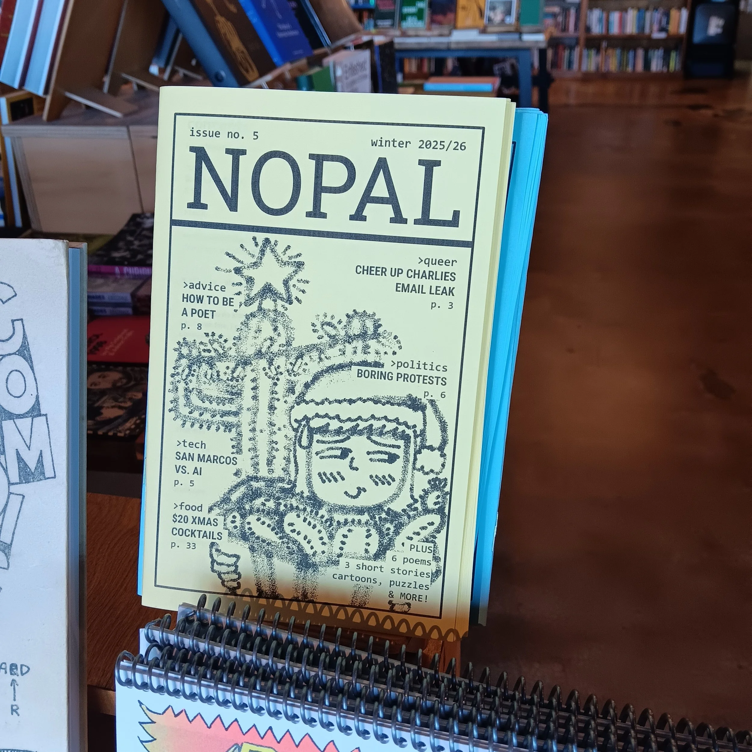 Nopal Magazine is an Austin-based "low budget New Yorker" featuring short fiction + poems about being on your phone, furry cartoons, hyperlocal news, interviews, and stupidly difficult crosswords.Description goes here